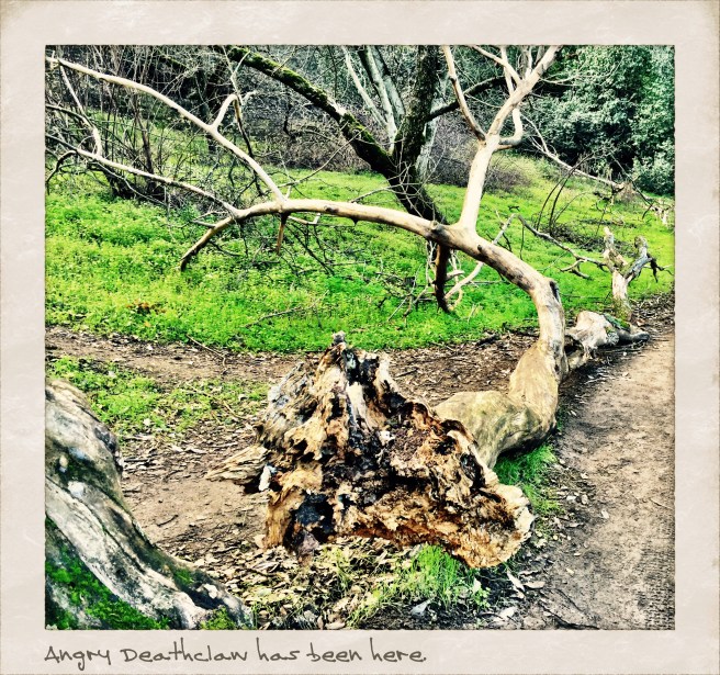 Yikes. I thought The Deathckaw was back up the hill over that ridge. Seems odd that it would be down here. And ah, the massive log was happily attached to a tree as I passed through here earlier. Best to keep on high alert. Angry Deathclaw = bad news + several Stimpacks.