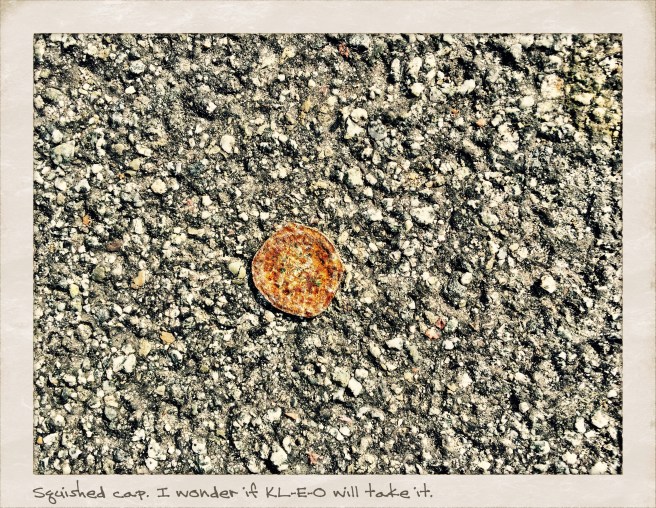 I sure hope KL-E-O takes this crushed bottle cap I found on the road. Then again, what can you buy with one crushed bottle cap besides a wisecrack these days?  Inflation.