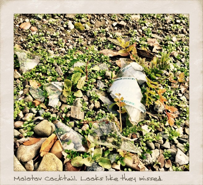 Whoever threw this Molotov Cocktail obviously missed. No charred remains.