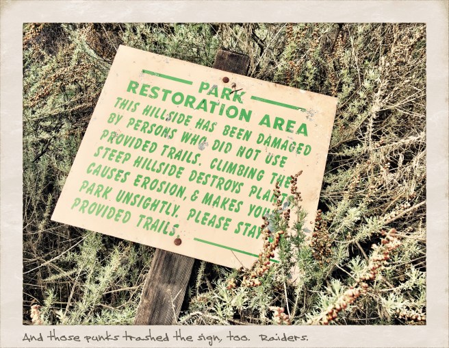 It’s a wonder we – as a society – didn’t implode earlier. The sign clearly says to stay on the trails.  As you can also see, no one paid attention to it. Seriously, a few well-placed laser traps would nip that problem in the bud.