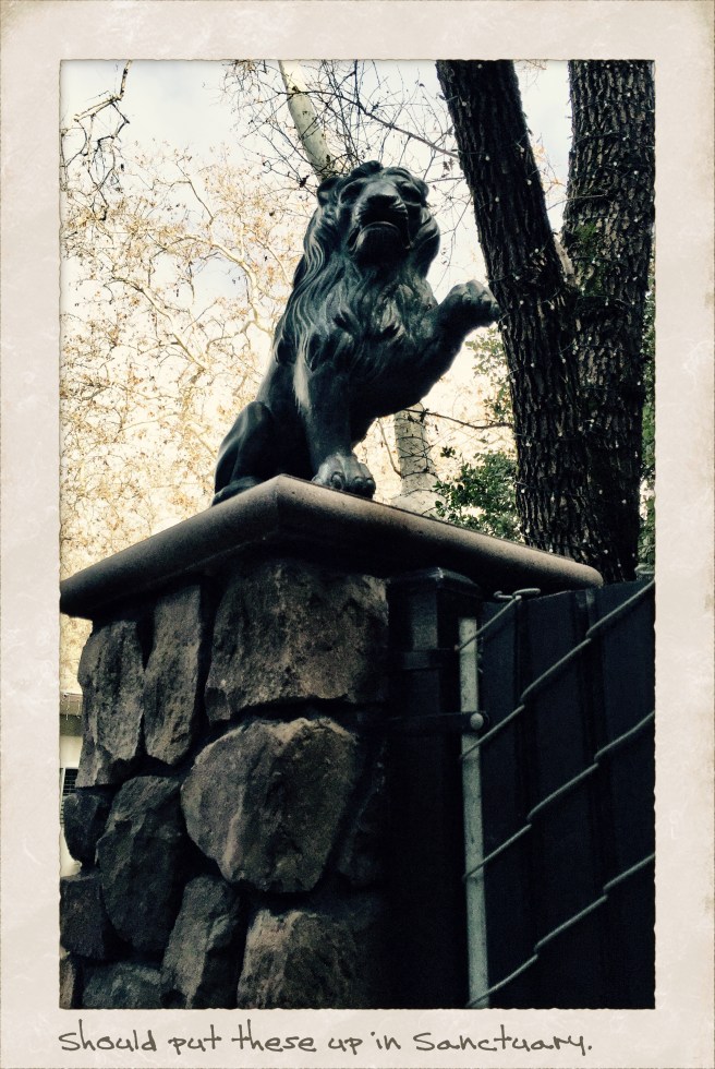 I love those lion statues!  Seriously, I need to find that issue of Picket Fences so I can put them up in Sanctuary.  I think it’ll be a nice change of pace from all the machine gun turrets. Yep. The Settlers complain about those, too. And how loud the generators are. Seriously, people, would you rather walk the Commonwealth as Stingwing fodder?